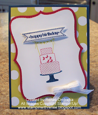The stamp set is called Make a Cake and the words are from a stamp set called Itty Bitty Banners. The DSP is called Patio Party and the ribbon is a new Stitched Whisper White Grosgrain. Do you want to know the best part of all these goodies? They were all absolutely FREE!!! Yes FREE because I signed a new recruit during our recent Sale-a-bration. Did I have to cut the banner out freehand you ask? Well thanks for asking. No I didn't. There is a new set of Framelits called Bitty Banner Framlits and it matches.......you guessed it, the Itty Bitty Banners stamp set. The colors I used here are Summer Starfruit, Midnight Muse, Raspberry Ripple. Oh and the ribbon is so easy to tie,. Not stiff like the old grosgrain ribbon.