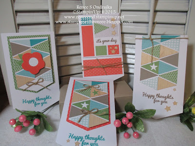 The flower is punched out with the Pansy punch. The two layers that is the focal piece were made using the Lots of Labels Framelits. These are new framelits for the Big Shot. I added some of the Tip Top Taupe 1" Dotted Lace Trim that I adhered with some of our new Tear and Tape Adhesive. This gives us the same great hold as the sticky strip did, but you can tear it instead of having to cut it. Colors I used here are: Watermelon Wonder, Wild Wasabi, Whisper White. The little flowers were stamped in Pink Pirouette. The stripped paper is from the DSP paper stack A Cherry on Top. I added a few Adhesive Backed Rhinestones to finish it off. The focal point piece is popped up with Dimensionals as well as the punched flower. Well at least that is a start to getting to know this set.